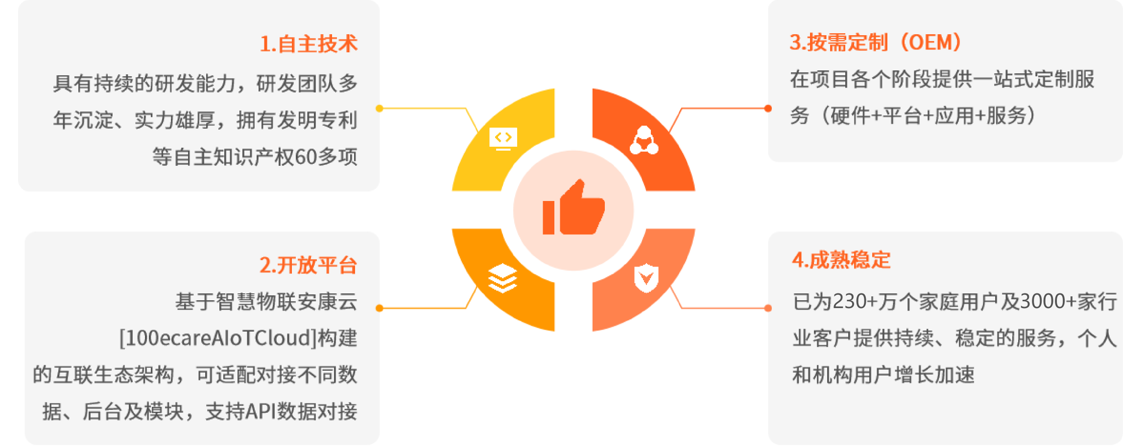 爱牵挂智慧养老解决方案具有开放性、灵 活性、兼容性等优势,硬件、平台、App均可根据客户需求进行定制。